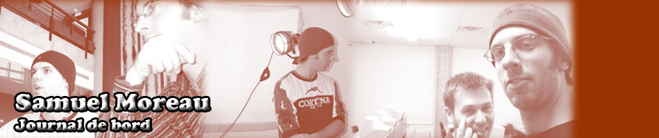 Aujourd'hui, ce fût une journée chargée comme tous les autres. Les évènement entourant le WebJam sont commencés. Nous avons écourté notre rencontre d'équipe hebdomadaire pour assister à une conférence sur les perspectives d'emplois dans le multimédia. Ce fût très intéressant! Nous avons par la suite réamorcé notre rencontre pour séparer les tâches des remises à effectués à la prochaine présentation. L'écriture du scénario et les premières esquisses sur papier sont maintenant officiellement entreprises. Cela veut dire que nous commencons à entrer graduellement dans le concrêt du projet... finalement!